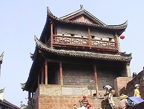 東門城樓始建于清康熙五十四年(1715年),城門下部由紫紅砂巖砌成,上部城樓則用古磚砌筑。城門寬3.5米,高4米,呈半圓拱,兩扇城門都用鐵皮包裹,用圓頭鐵釘密釘,牢實堅固。城墻修筑全部用紅砂條石,精工細鉆,規(guī)格一致,城墻厚0.8米,下部內(nèi)外兩側(cè)用條石加石灰漿砌成,中間填以碎石粘土,層層夯實;頂部的中間填充物改為石灰、鵝卵石、黃土拌成的三合土,厚約0.33米,上面鋪以紅砂塊石。城樓高11米,大門上方有槍眼8孔。歇山屋頂,覆以腰檐,飛檐翹角,精美壯觀。