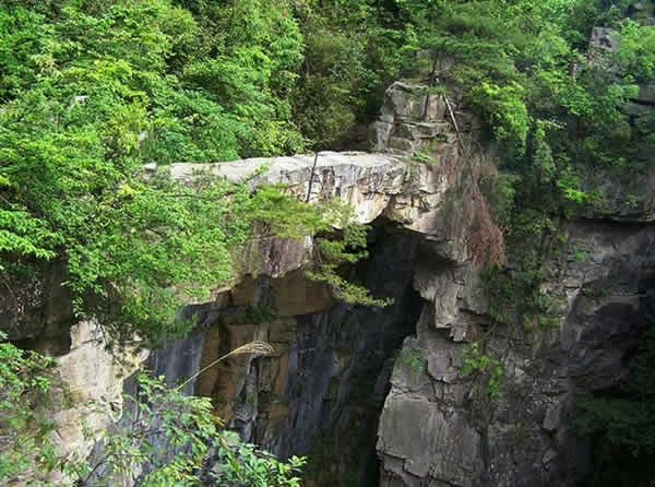 仙人橋又稱天下第一橋,坐落在猴子坡上、天子峰下的王爺洞對(duì)面。橋?qū)僮匀恍纬,長(zhǎng)26米,寬1.5米,厚一米多,高約六七十 米,飛架在兩岸懸崖絕壁之上,鬼斧神工,惟妙惟肖,古人云:“天地可掬,此真天造也”。仙人橋?yàn)榧t砂巖結(jié)構(gòu),兩端生有高大的黃山松和杜鵑樹,濃蔭掩映,極其美麗。橋的東頭還有自然形成的石級(jí),人可順石級(jí)而下,走上天橋,下視萬(wàn)丈深淵,令人頭暈?zāi)垦,非健壯者不敢逾越,旅游者無(wú)不贊嘆,說(shuō)它是“天下絕景”。