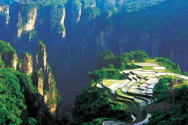 空中田園坐落在天子山莊右側(cè)經(jīng)老虎口、情人路方向兩公里處的土家寨旁,海拔1000余米。它的下面是萬(wàn)丈深淵的幽 谷,幽谷上有高達(dá)數(shù)百米的懸崖峭壁,峭壁上端是一塊有3公頃大的斜坡梯形良田。田園三方峰巒疊翠,林木參天,白云繚繞,活像一幅氣勢(shì)磅礴的山水畫。登上“空中田園”。清風(fēng)拂袖,云霧裹身,如臨仙境,使人有青峰鳴翠鳥,高山響流泉,身在田園里,如上彩云間”之感。