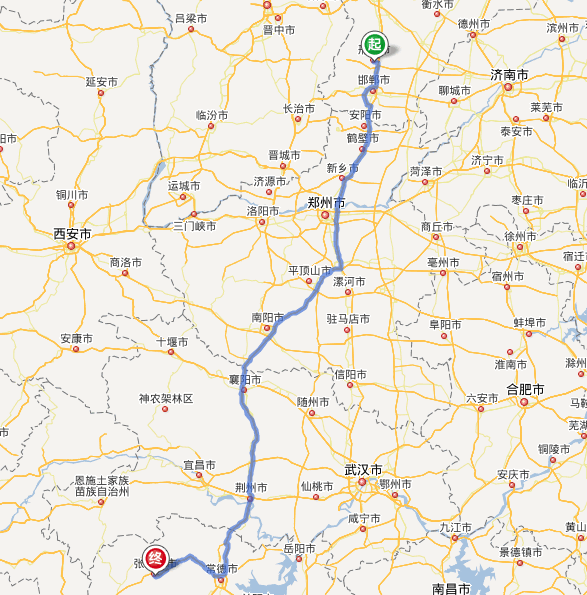 左右,沿途經過邢臺——邯鄲——安陽——鶴壁——新鄉(xiāng)——鄭州——許昌——平頂山——南陽——襄陽——荊門——荊州——澧縣——石門縣——慈利縣——張家界。