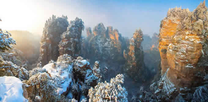 楊家界雪景 作為世界自然遺產(chǎn)武陵源四大核心景區(qū)之一的楊家界景區(qū),地勢(shì)險(xiǎn)要,風(fēng)景絕美,跟張家界、天子山、索溪峪比較,其中的地質(zhì)地貌一部分相同外,又有其獨(dú)特的資源優(yōu)勢(shì),擁有全球罕見(jiàn)的峰墻群奇光。乘坐在舒適的楊家界索道里,可以盡情體驗(yàn)“會(huì)當(dāng)凌絕頂,一覽眾山小”的居高臨下與動(dòng)感,360度暢游夢(mèng)想般的楊家界仙界,俯瞰“近在咫尺”的千山萬(wàn)壑,山舞銀蛇,千嬌百媚的絕美“峰墻”盡收眼底,無(wú)限風(fēng)光在險(xiǎn)峰,數(shù)十道氣勢(shì)如虹的石墻,一排排層巒疊嶂,相對(duì)平行而立,高矮參差不齊,宛如“天然長(zhǎng)城”,真是美輪美奐,絕景天賜,不得不讓人驚嘆大自然的璧山開(kāi)地之功。