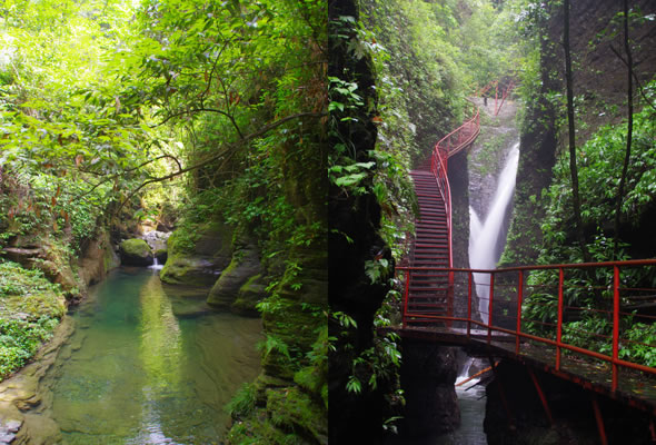 十八潭總名。稍作休憩,我們開始奔赴東線的景點(diǎn)。東線主要是以十八潭為主,下游有4潭:合潭、梳妝潭、魚潭、黑潭;中游有9潭:換衣潭、美人潭、石蛙潭、姊妹潭(3個(gè))、情侶潭(2個(gè))、二龍搶珠,上游有5潭:鬼谷神功(2個(gè))、幽潭、落銀潭(彩虹潭)、路邊潭。十八個(gè)潭深淺不一,淺則1米以上,深則4米左右,形狀各異,有的月牙形,有的豬腰狀,形狀不規(guī)則,石壁上水沖成潭,真是鬼谷神功,此處水質(zhì)細(xì)膩,加之綠林映襯,水色碧綠見底,猶如十八顆翡翠石鑲嵌在山林之間,涓涓溪流晶瑩剔透,飛流直下的瀑布,氣勢磅礴,蔚為壯觀, 下游的4潭,合潭、梳妝潭、魚潭、黑潭。合潭是仙女峽谷與十八潭的交匯處;梳妝潭的水清如明鏡,又因?yàn)樘秲蓚?cè)石頭的封閉,使這面鏡子靜止不動(dòng),很方便梳妝,照鏡子。在梳妝潭周圍,有一種植物屬于紅豆杉系列,它的形狀好似梳子,可以用來梳頭。魚潭可不能望文生義。魚潭,是在冬天的時(shí)候,所有的魚都聚集在這里過冬,除此之外,這個(gè)潭水淺見底,冬天魚苗聚集,是捕魚的好季節(jié)。黑潭,水深不見底,所以叫黑潭,F(xiàn)在已經(jīng)看不見梳妝潭、魚潭、黑潭了,你猜為什么?建水庫,建水上樂園,淹沒了。 斷魂石的傳說。三國時(shí)期,高氏和蕭氏一對(duì)夫妻春節(jié)忙活,遇上了天門垮眼,受余震襲擊,打死了丈夫蕭氏。高氏思念丈夫,淚哭不斷,結(jié)果摔死潭中。人們經(jīng)常還能聽到哭聲傳來,不敢單獨(dú)行走,需成群結(jié)隊(duì)。后人為了鎮(zhèn)邪,雕刻一條蜈蚣驅(qū)趕哭魂,多年后,蜈蚣成精,天上打雷,巖石發(fā)光,遭雷所劈,成了斷魂石。 和尚姥,也就是丹灶峰,天門十六峰之一。相傳此峰為仙人化身,赤松子曾在此煉丹,許多詩人在此留下了美妙的詩篇,明代葉守禮《丹灶峰》: 懸崖峭壁隔塵寰,上有仙人學(xué)煉丹。 煉得丹成鶴已去,獨(dú)留丹灶在峰巒。 意思是說,在這險(xiǎn)峻秀麗的山峰上,赤松子潛心煉丹,不受塵世干擾,身心沉醉于秀美的山間,沉溺于丹藥的煉制之中。作者很是羨慕那種與世隔絕的超脫,那種執(zhí)著于自我理想的瀟灑,你羨慕不羨慕? 竹林叢生。我們要學(xué)習(xí)竹子的精神,中空、謙卑;我們要學(xué)習(xí)竹子的精神,抱團(tuán)生長;我們要學(xué)習(xí)竹子的精神,破土而出,節(jié)節(jié)高。 向家塔。打造農(nóng)耕養(yǎng)生游的地方。種田、種菜、種花,農(nóng)家餐館。 爛泥巴根。爛泥巴根和馬桑樹是同科,是這里獨(dú)特的一種樹。馬桑樹亦稱“千年紅”、“馬鞍子”,屬落葉灌木,馬桑樹多枝叢生,一簇一簇的,枝葉像傘蓋,因此“馬桑樹兒搭燈臺(tái)”。春風(fēng)一吹,滿山的馬桑樹、爛泥巴根就吐翠滴綠,顯示出強(qiáng)勁的生命力。打油詩一首: 青青枝條四方走, 肥肥大葉落上頭, 身在路邊無人問, 冬去春來樂悠悠。 秋天死亡,春天長勢更加茂盛,它的新生是通過死亡實(shí)現(xiàn)的。山川如此,植物也是如此,這里的一草一木無不透露著道家那種齊生死、等貴賤的精神。 這叫“常道”亭,“道可道,非常道”,據(jù)說是白狐與劉海相遇的地方。吊橋。 十八潭各具特色。 中游有9潭。第五潭叫換衣潭。巖石聳立,霧氣氤氳,巖壁上布滿水汽,猶如雨下。又因過道狹窄,行人需彎腰通過,未免雨水打濕衣裳,在此就要脫下身上衣物,通過后在第六潭再穿上。因此第六潭又叫美人潭,很幽深神秘的。第七潭叫石蛙潭,水淺,又比較平穩(wěn)、安全,春天產(chǎn)籽。余音回響,猶如蛙鳴,給人“聽取蛙聲一片”的錯(cuò)覺。 對(duì)面巖壁叫“臘肉鋪”,那條自上而下的溪流叫“酒長流”,客人來了,咱土家人熱情,臘肉下炕,苞谷燒,喝兩口! 第八潭第九潭叫情侶潭,比較隱蔽,他倆靜悄悄地談著情話,我們快走,不要打攪他們。 第十潭、十一潭、十二潭叫姊妹潭。下面那個(gè),水淺淺的,溫溫的,是幺妹潭,中間那個(gè)是二哥潭,上面那個(gè)是大哥潭。 潭的旁邊有珍稀植物馬蘭花,馬蘭花又名蝴蝶花、蝴蝶蘭,為多年生宿根草本花卉,根莖短粗,肥壯。花大新奇,花色絢麗,鮮艷奪目;ㄓ兴{(lán)、白、黃、雪青等色;ㄆ5-6個(gè)月,每次花可開花7-10天,頗耐觀賞。馬蘭花在我國栽培已有2000多年的歷史,目前歐、亞、非3洲均有分布,品種極多,難以計(jì)數(shù)。此花按植株高度不同可分3種類型:矮株型僅18-25厘米,中株型高25-70厘米,高株型可高達(dá)120厘米。馬蘭花喜陽光,適栽于背風(fēng)向砂質(zhì)土壤中。 馬蘭開花的童謠。他們?nèi)⒚眯r(shí)候情感深厚,常常一起跳皮筋。大家會(huì)跳嗎?會(huì)唱嗎? 小汽車,滴滴滴,馬蘭開花二十一, 二五六二五七,二八二九三十一, 三五六三五七,三八三九四十一, 四五六四五七,四八四九五十一, 五五六五五七,五八五九六十一 ! 還有紅豆杉,像梳頭的篦子,叫“篦子三尖杉”。還有蘭心草,中草藥,空中飄來蘭花的香氣,山谷中峭壁的蘭花,如芳芳人品善良高雅。蘭花如人品有宜人的香氣,蘭花有撩人的幽香,任何花卉的香氣都不能與蘭花比。這幽香時(shí)隱時(shí)現(xiàn),時(shí)濃時(shí)淡,時(shí)遠(yuǎn)時(shí)近。飄蕩在老道灣山谷中,給人清新和愉快的感受。 蘇轍有詩:“谷深不見蘭生處,追逐微風(fēng)偶得之”。 還有大葉榕、玉葉金花、秋海棠、臘蓮繡球、四字馬蘭、紅楓,秋天來臨,看!漫山紅遍,層林盡染。 聞道亭。孔子曰:朝聞道,夕死可