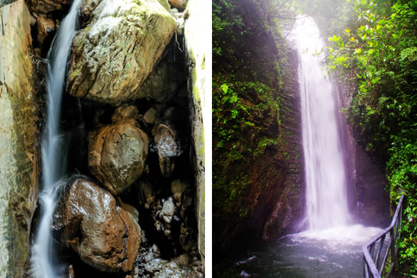 西線原名叫雪花溪,又叫雪花洞,水從懸崖上掉下來濺起水花,泉水與巖石相碰,落成大霧,形成雪花狀,故名雪花溪。因地勢險(xiǎn)峻,歷代人都沒有把雪花溪走通過,從下往上看深不見底,古人以為是一個(gè)洞,故又叫雪花洞,其實(shí)是一個(gè)峽谷,有七潭七瀑,現(xiàn)在叫“仙女峽谷”。峽谷長800米,最窄處僅1米左右,上下落差近200米,因水的長期回旋沖刷, 巖層的堅(jiān)硬度各異,形成了底寬頂窄,時(shí)北,時(shí)西,時(shí)東,陰暗無光,形似溶洞, 泉水飛流直下,形成梯級瀑布,擊打在巖壁上濺起的水花猶如雪花飛舞,潭中一片雪白,古人稱之為雪花洞,峽谷中有七個(gè)各異的潭池在沖擊的水花中若隱若現(xiàn),故改稱為七仙女人間沐浴瑤池,從開天辟地起無人行通過,現(xiàn)在已修好的占道,于峽谷水花之中,幻入仙境之感。