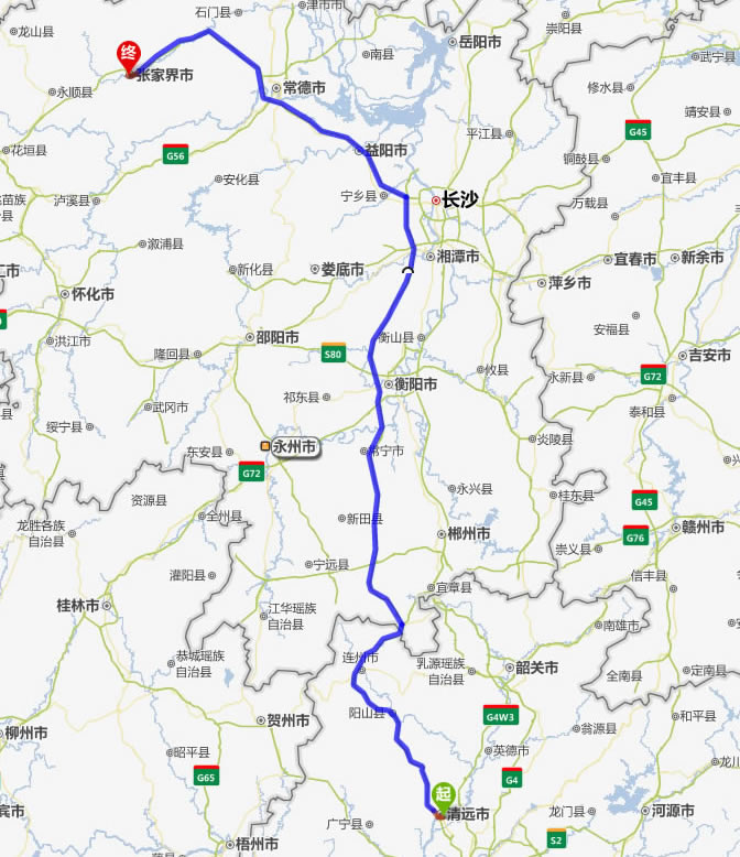 清遠(yuǎn)去張家界自駕車(chē)自助游線(xiàn)路圖全程高速):