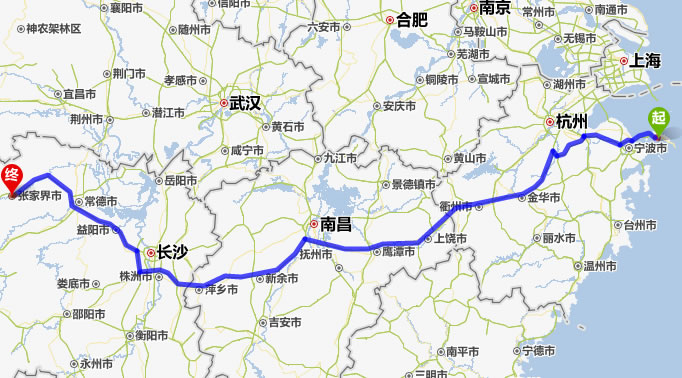 左右,沿途經過舟山——寧波——紹興市——金華市——衢州市——上饒市——鷹潭市——新余市——宜春市——萍鄉(xiāng)市——株洲市——湘潭市——寧鄉(xiāng)縣——益陽市——常德市——慈利縣——張家界。