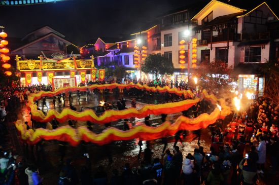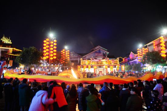 火龍出場,街區(qū)狂舞;盤龍點睛,眾人祈福。12月21日,農歷冬至,當天夜晚在旅游勝地張家界武陵源區(qū)溪布老街擺手堂廣場啟動的 “武陵腔調:趕火趕戲趕大年”活動儀式上,一條全身似火的長龍在近百名土家兒女的舞動下 “閃亮”登場,格外耀眼。據了解,這條長龍身有香味,全長108米,是目前世界最長的香火龍。